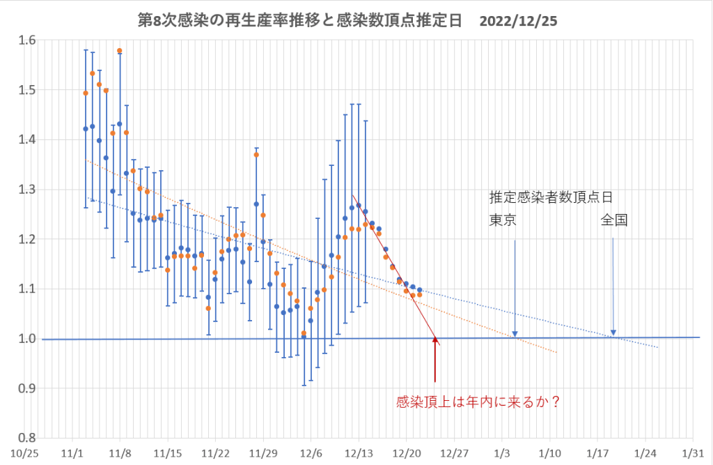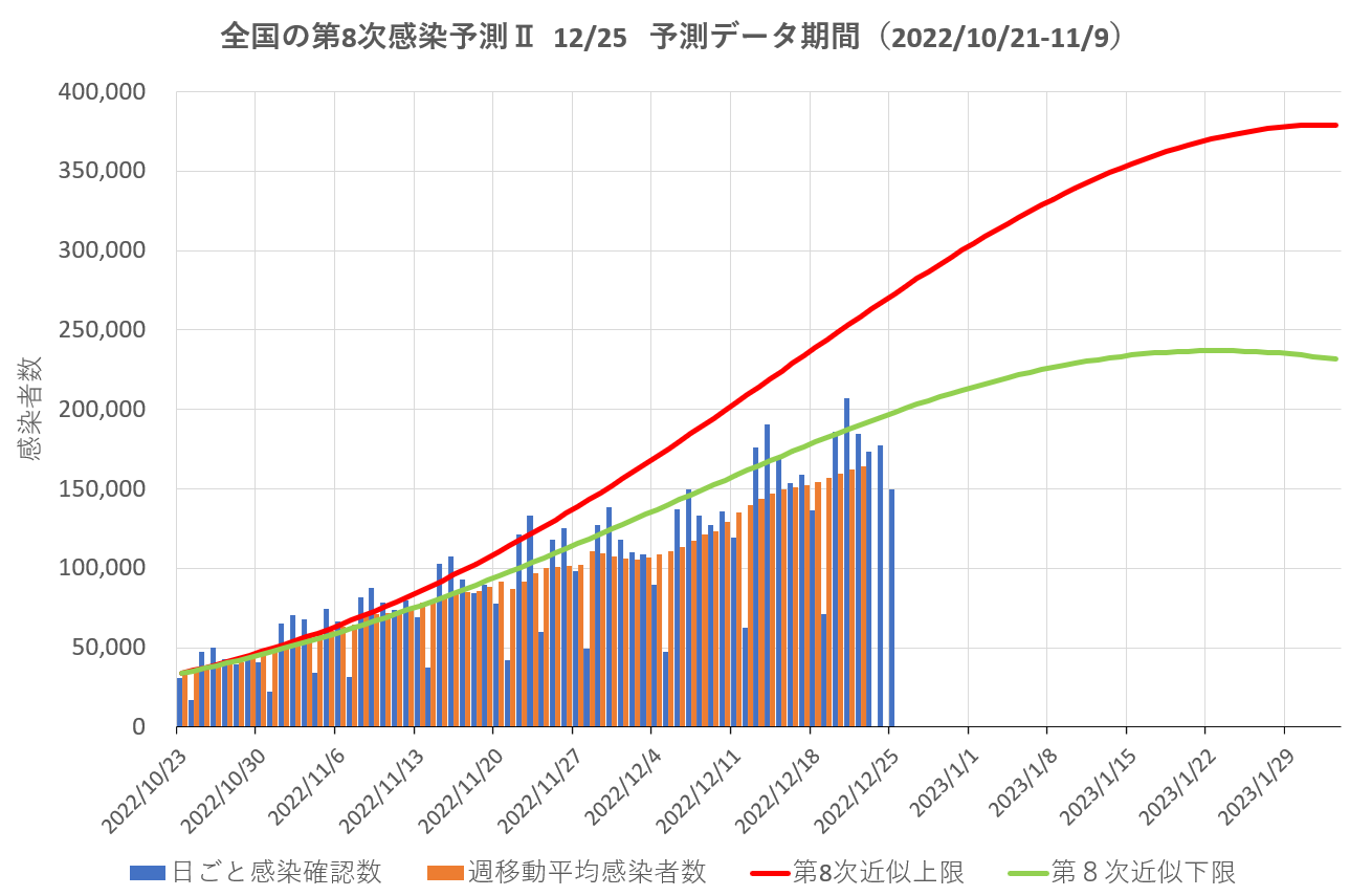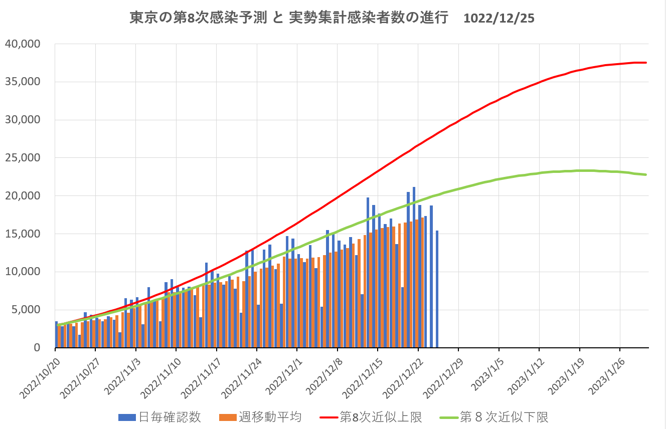 10月21日~11月9日のデータを用いて推定した予測曲線の下限以下で進む日毎感染確認数の様子。全国もと東京も。