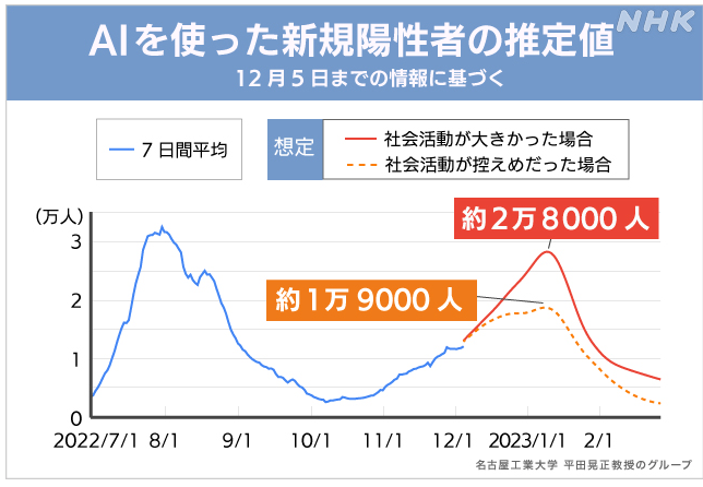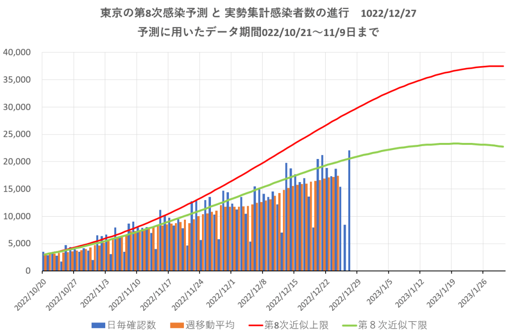 11月9日までのデータを用いた私の予測と厚労省の感染確認者数集計値の推移。予測の上限と下限はデータの確率誤差によるもので、社会活動を予測根拠とするデータは考慮していない。