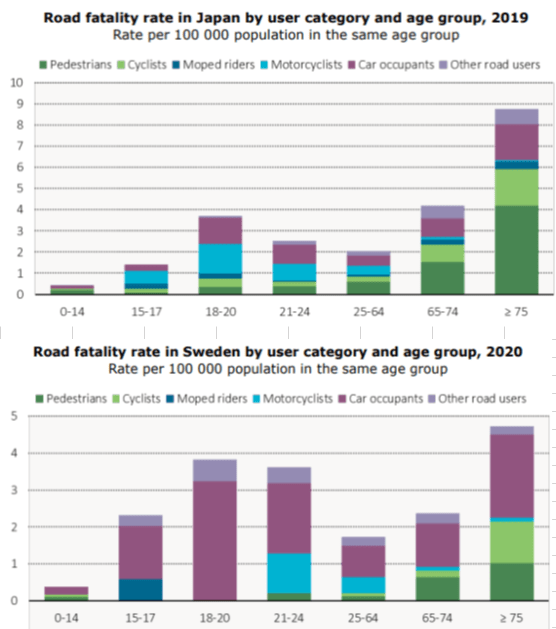 極端な違いは、総交通手段に於ける乗用車乗車中と歩行と自転車交通中での死亡率分布で、日本は乗用車乗用中に比べ歩行と自転車(自動2輪)の死亡率が高く、特に高齢者に於いては極端に多い(75歳以上で70%弱)。スウェーデンでは(同46%)乗用車乗車中の死亡事故の方が各年齢層を通じて多いことが分かる。