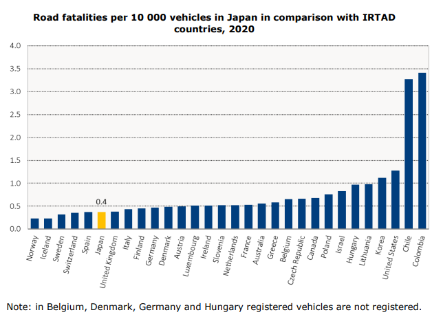 しかし、スウェーデンの運転が乱暴で死亡事故率が高いとの判断は間違いである。3枚目のグラフの様に自動車10万台当たりの死亡者数は日本よりわずか少ない、世界の死亡順位登録で少ない方から3,6番目を争う横並びと云ってもよいだろう。