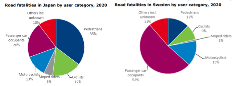 極端な違いは、総交通手段に於ける乗用車乗車中と歩行と自転車交通中での死亡率分布で、日本は乗用車乗用中に比べ歩行と自転車(自動2輪)の死亡率が高く、特に高齢者に於いては極端に多い(75歳以上で70%弱)。スウェーデンでは(同46%)乗用車乗車中の死亡事故の方が各年齢層を通じて多いことが分かる。