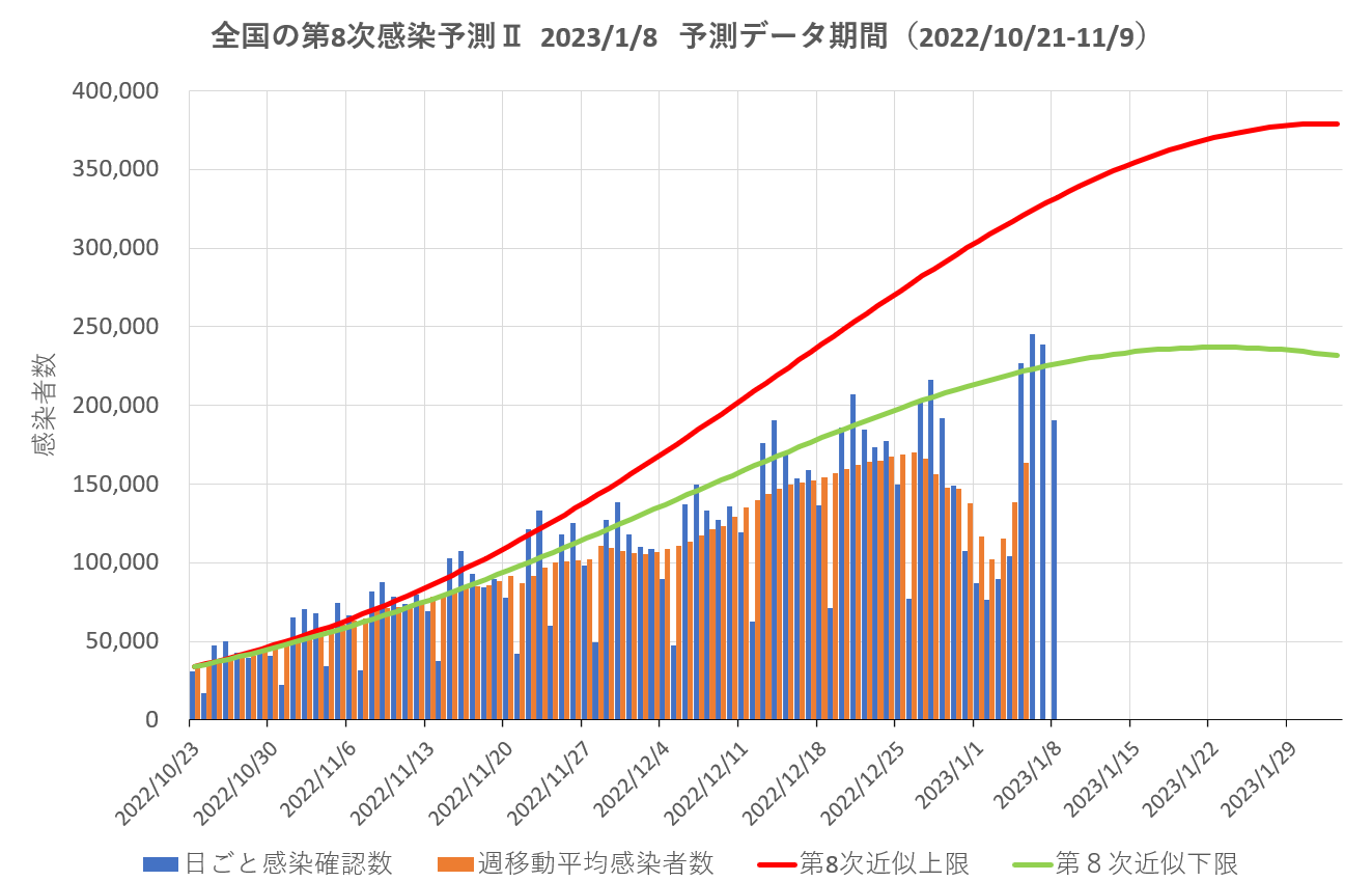 COVID-19 第8次感染者推計値の推移 2次多項式近似曲線を加えて見ました →