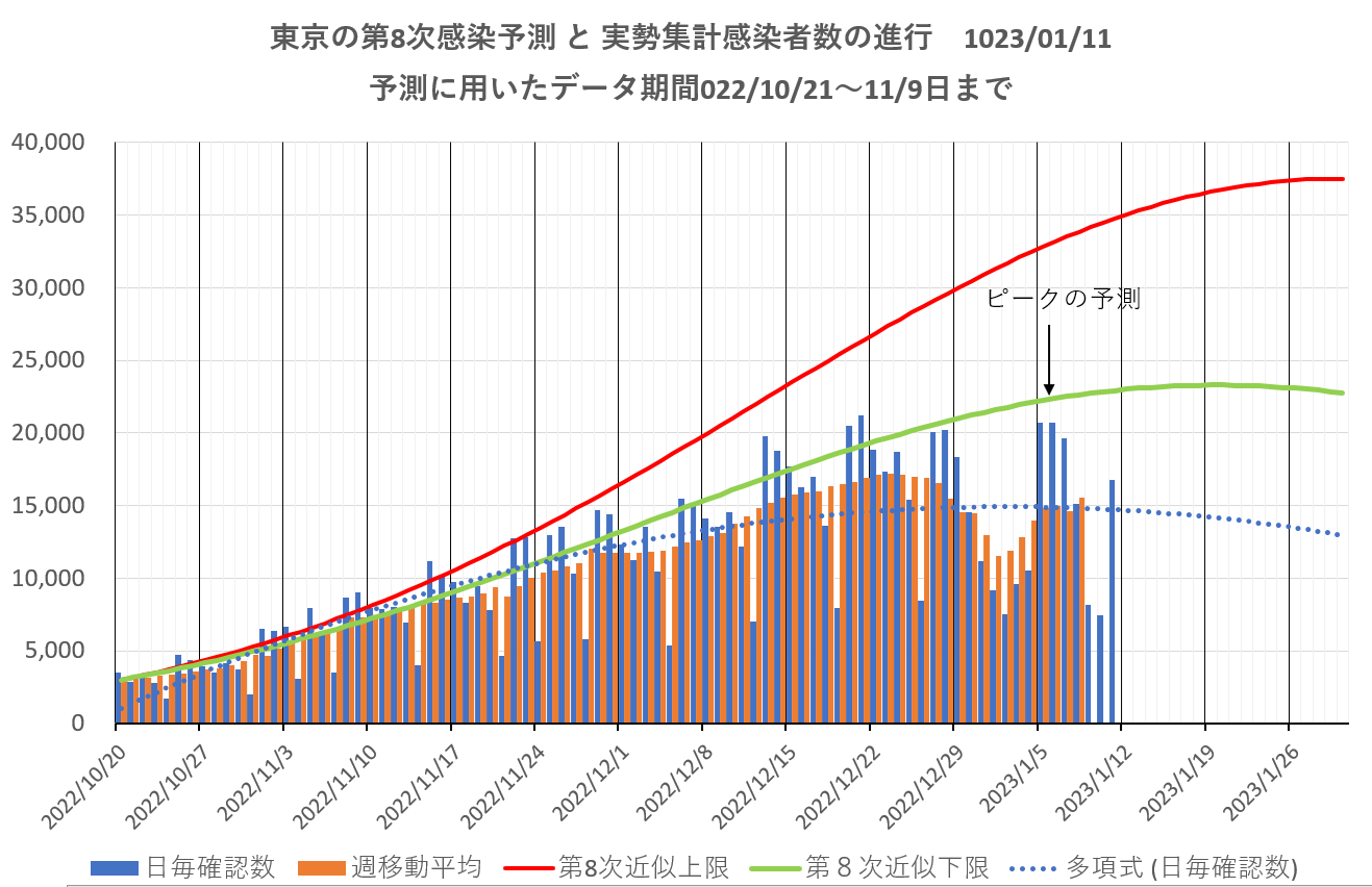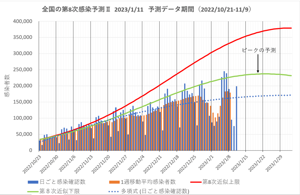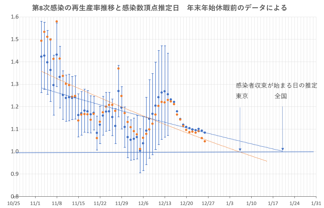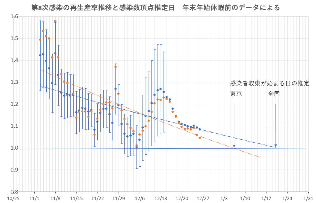 年末年始の休暇に入るまでのデータ系列で簡易再生産係数の指数近似値を求め、その曲線から感染確認者数ピークの予想日を推定した。