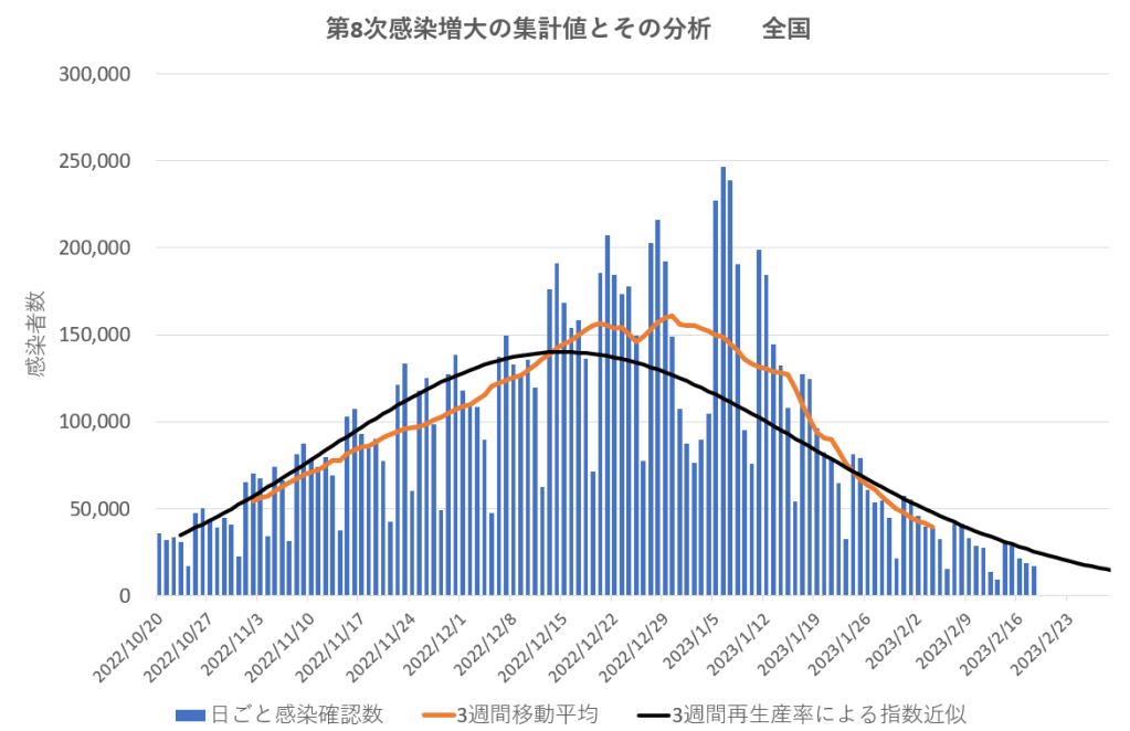 それを軽減するために、厚生労働省の日ごと感染確認数の3週間移動平均値について簡易週間再生産率を求め指数関数式による感染曲線を試算した。