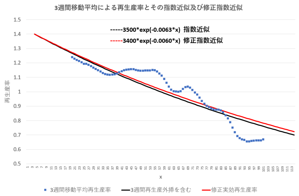 3週間移動平均から求めた簡易再生産率とその指数近似、及び上グラフで用いた修正再生産率近似との関係を下のグラフに示す。