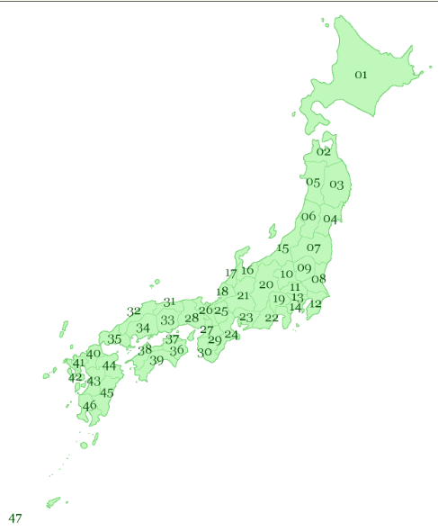 日本の47地方行政区には北東の北海道を1として南西方向に沖縄まで順次コード番号が割り振られている。地図参照。したがって、行政区域間の相互距離を概観するための便法として、このコード差を用いてみた。