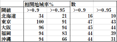 他の国内全域は東京や大阪との相関関係が大きく、相関係数0.95以が90%以上を示し、殆どの地域が東京、大阪より遅れて感染推移が移っていることから人口交流の大きい東京、大阪が感染の発生源であることが推定される。