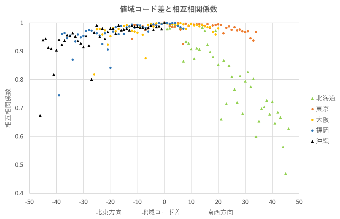 ここでは、最北端の北海道、最南端の沖縄、人口交流の多い東京と大阪の5地区を基準地域として、全国47地域との日ずらし相互相関係数の最大値を比べてみた。