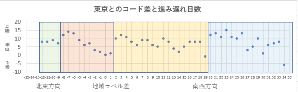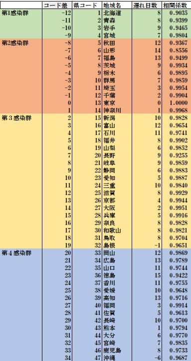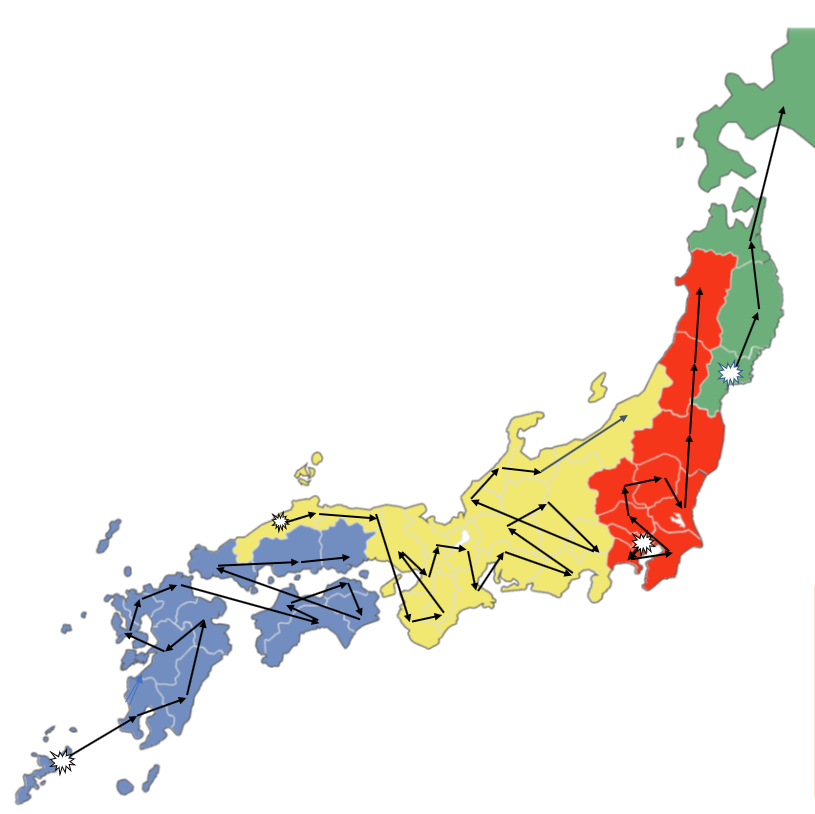 直前のブログに書いたように日本各地の感染時系列推移曲線の相互相関は良い事から、その日差を追随することで感染通路を推定してみた。