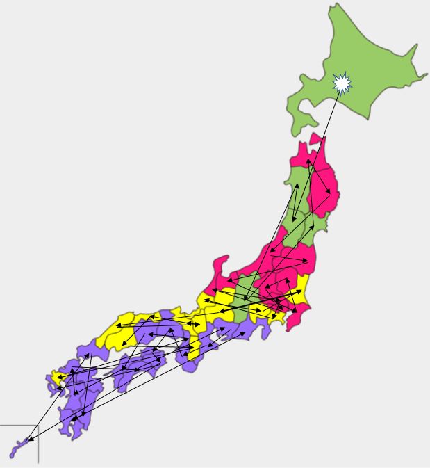 北海道に始まり東北地方に飛び火、感染は以後順次南下した。ビッグバーンから約5週間、沖縄まで蔓延していった様子を描いてみた。