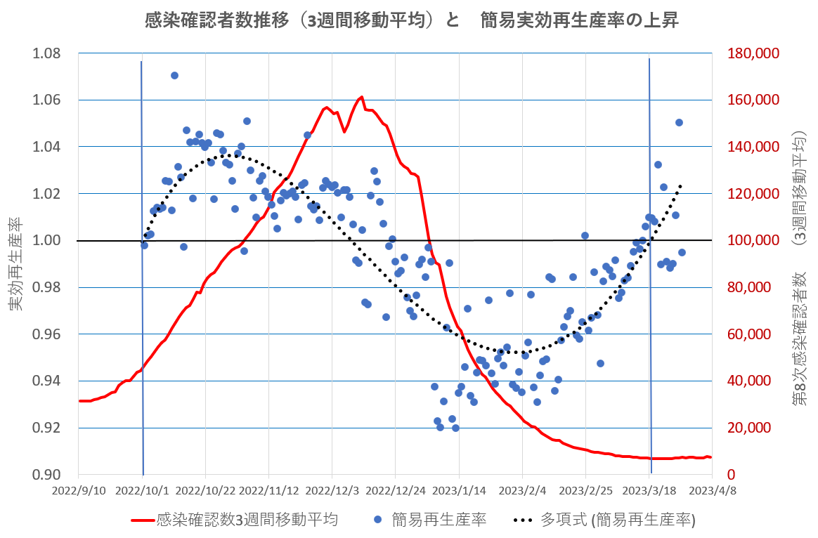 下のグラフで見ると、3月20日前後を境にして簡易再生産率が1.0を超えて上昇に転じたように見える。まだ確認感染者数が少なく統計誤差が大きいので何とも言えないが、残念ながら傾向は、第9次感染の始まりの様に見え始めた。