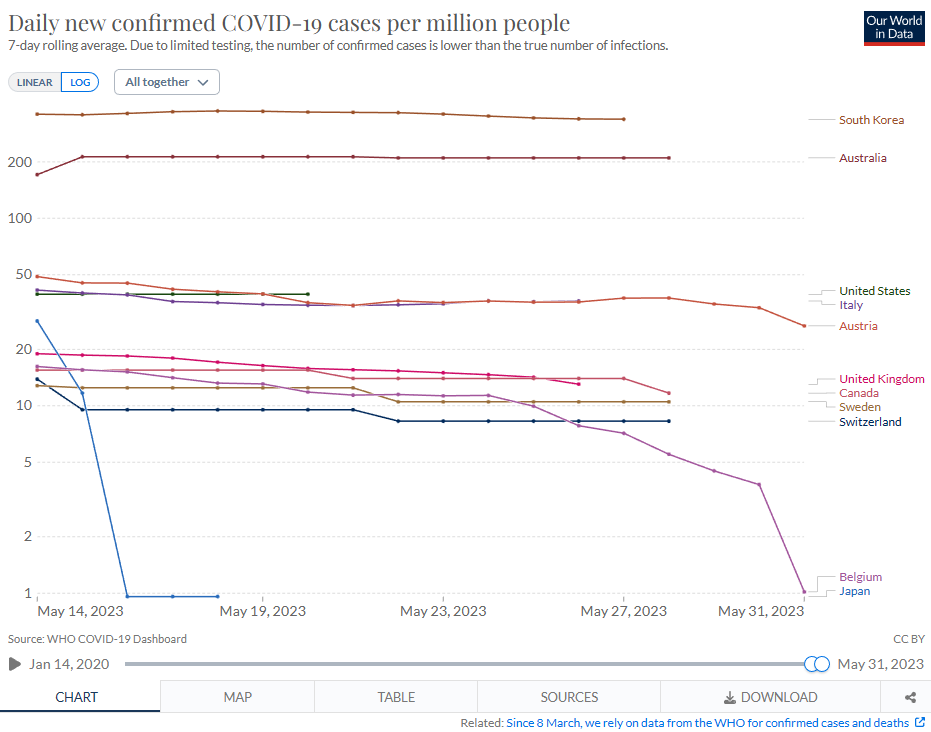 OWiDが集計して作成したグラフから: 我が国と関係の深い国々を拾い表示してみた。