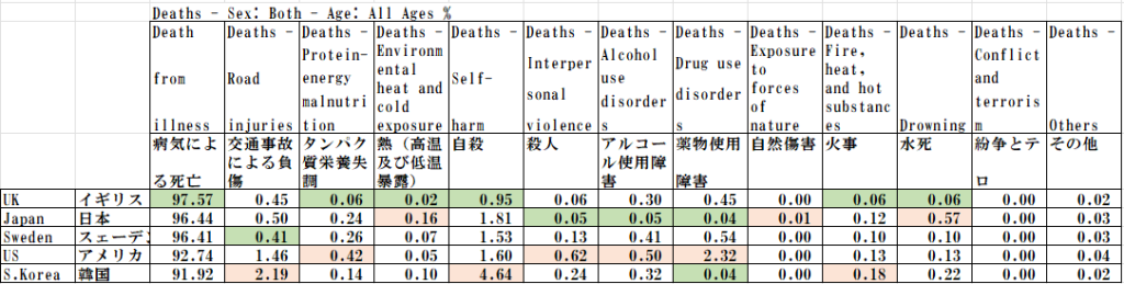 悪い原因は、日本は高温や低温環境が原因、韓国が交通事故・自殺。アメリカでは薬物などの違法行為やアルコール飲用に原因する不健康な行為が目立つ。