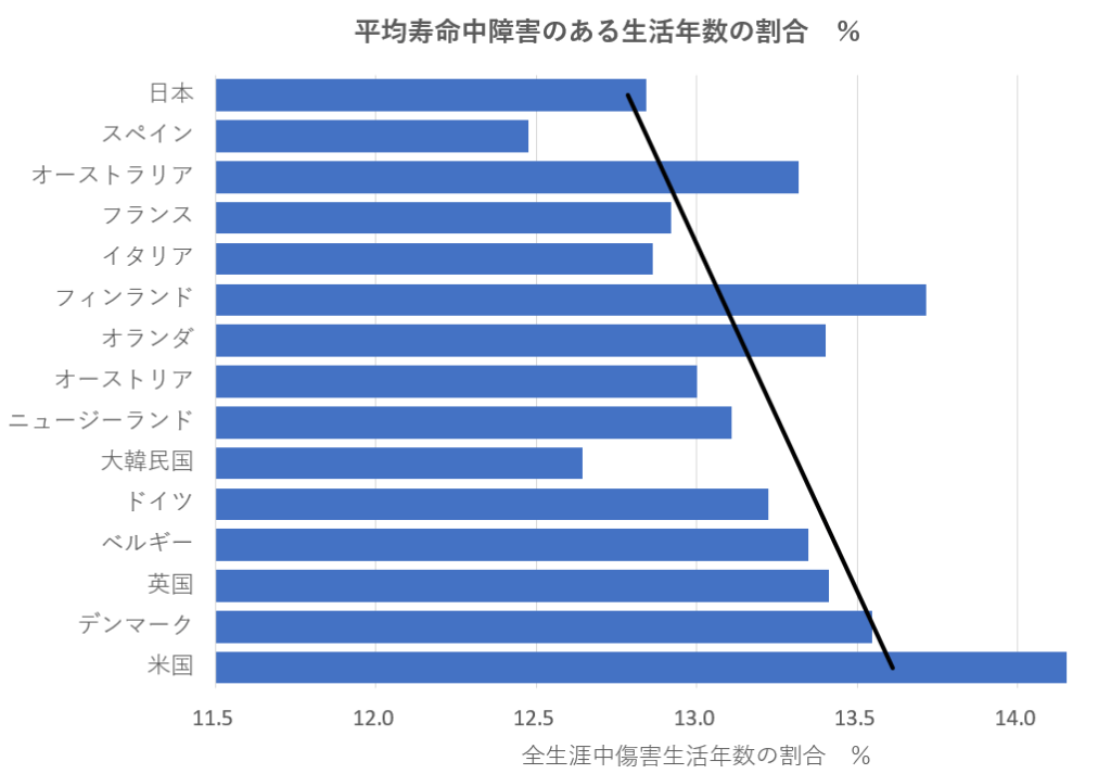 一般に、高所得国は医療や治療を受けることが出来病気や障害を抱えての生活が長くなるように思われるが、上記のような社会情勢のかなり似かよった先進国と云われる国々の間では、どちらかと云えば長寿国程障害生活年数率は短いと云えよう。