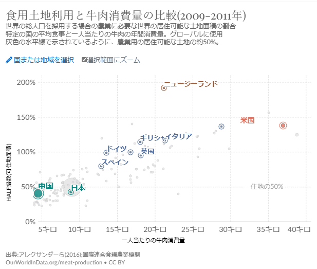 下のグラフで見ると、高所得国といわれる国々では牛肉の食習慣多く、土地需要が必要なことがわかる。