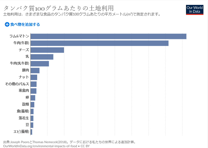 健康で高齢まで長寿を続けるには質の良いタンパク質の食事が必要である。そのような食料を生産するのに必要な土地面積を比べたのが次のグラフである。