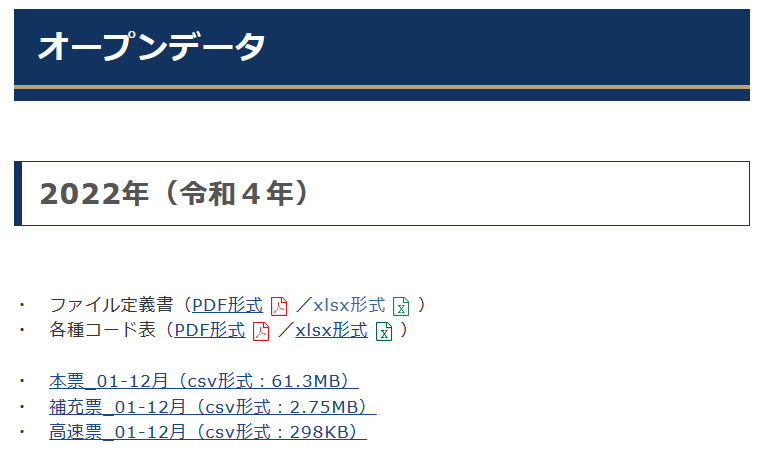 日本政府警察庁は左のようなデータベースを公表している。事故発生件毎の交通事故調査収録で、全国各地からの警察署の記録、年間30万件あまりの日順のcsvファイルである。