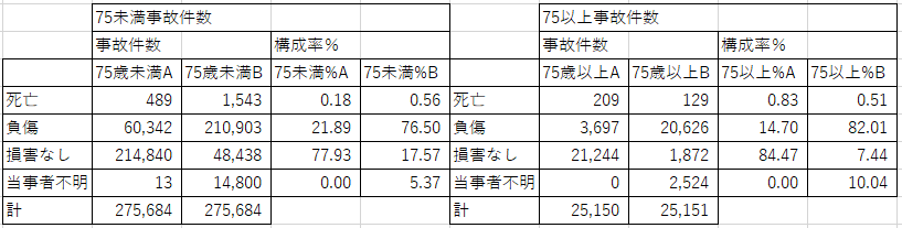 細かく見れば当事者Aでは高齢者側で単独事故の割合が多く、対人事故がわずかに多い。当事者Bでは損害なしと当事者不明事故が少なく負傷者が多く見える。