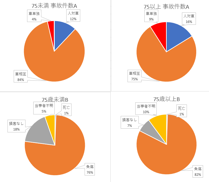 上記2表を円形グラフで表したものを見ると、事故に関する特性は75歳未満層と75歳以上で本質的には大差がないとみるべきであろう。