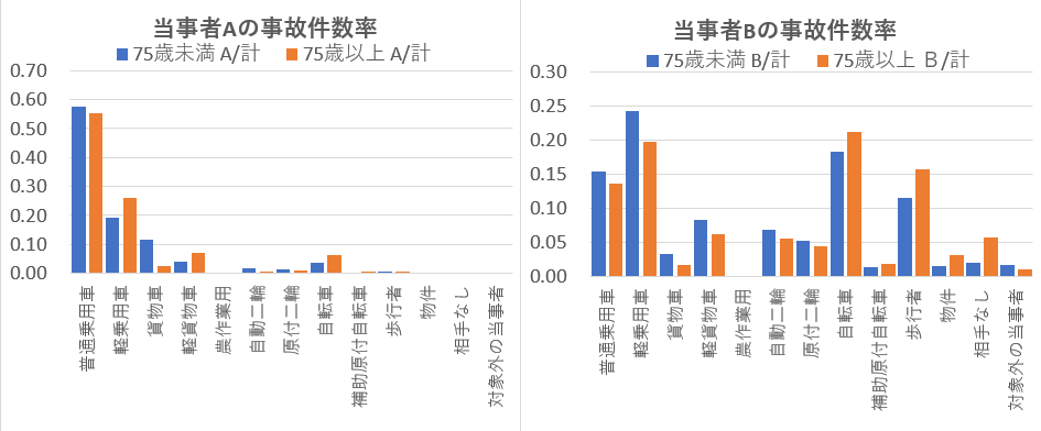 当事者Aの分布は両世代層で大差ないが当事者Bでは高齢者層の自転車・歩行者の被害件数率が大きい。