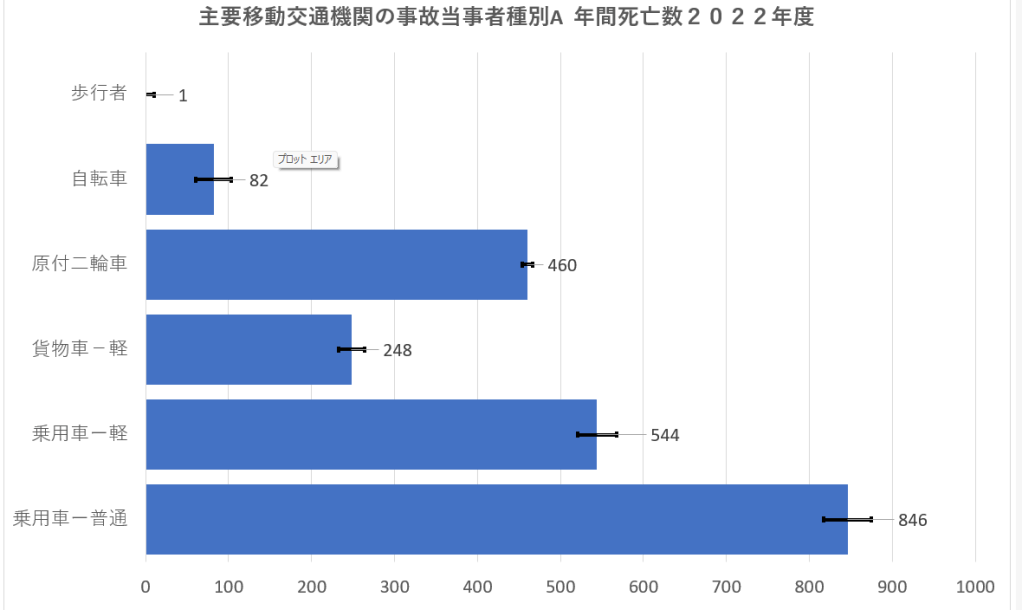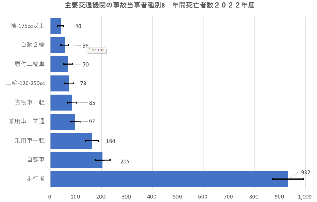 人々の生活移動に使用される主要交通機関の年間死亡者数を纏めたのが次のグラフである(2022年度)。警察庁のデータベース「オープンデータ」では事故当事者種別をAとBに分けて集計している。その分類基準の明確な記述は見られない。データの統計からみるとAは加害事故、Bは受動的な被害として警察の事故見分による報告記録の分類とみられる。