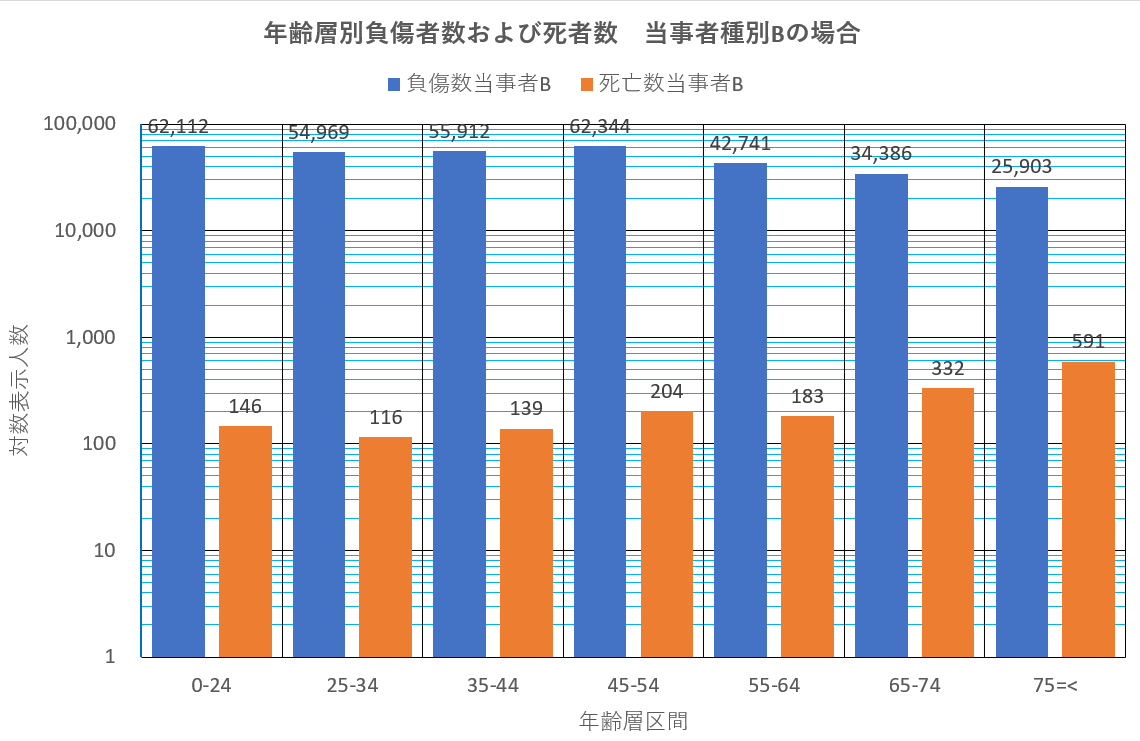 負傷者数は壮年55歳以上で減少に転じるが死亡者数は高齢に向かって指数関数的に増加しているように見える。全体の傾向を一つのグラフ上で表示するためグラフの縦軸は対数表示で示した。