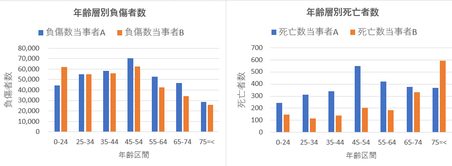 下のグラフは負傷者数と死亡者数をそれぞれ別の線形グラフで示したもので、左側負傷者数では45歳を起点に負傷者数が加齢とともに減少することが見られる。それに比べ、当事者区分Bの死亡者数は55歳以上で指数関数的に増加している。しかし、当事者区分Aでは死亡者数は減少を続けている。