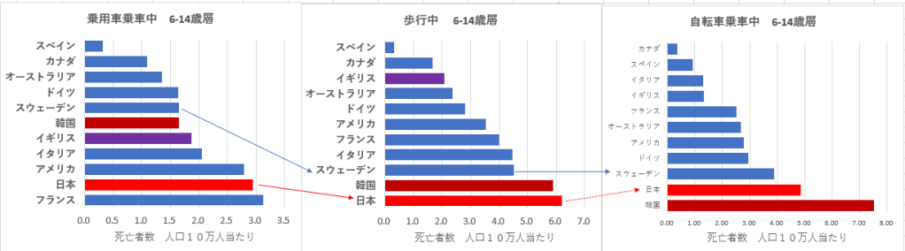 それに反し、子供、義務教育世代の交通事故死亡者数、この年齢層では、日本はすべての交通手段で該当人口当たりの死亡率順位が最下位に位置している。これは学校の登下校が危険な道路歩行や自転車に限られていることが原因している。安全なスクールバスの利用を拒否している交通安全行政、これは、事故は運転者の犯罪行為と決めつける警察、検察、裁判官などそれぞれの職業的認知バイアスが交通安全政策の障害になっている結果と思われる。