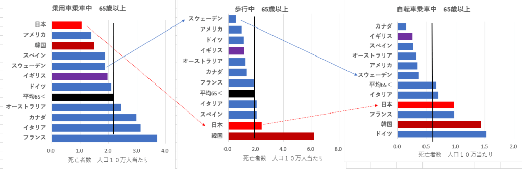 高齢者世代の交通事故死亡者数の場合、高齢者の乗車中事故死を見ても世界最小。高齢者も壮年者同様、乗車中事故死が多い証拠は見れれない。