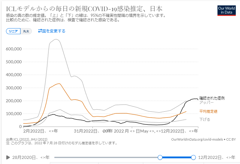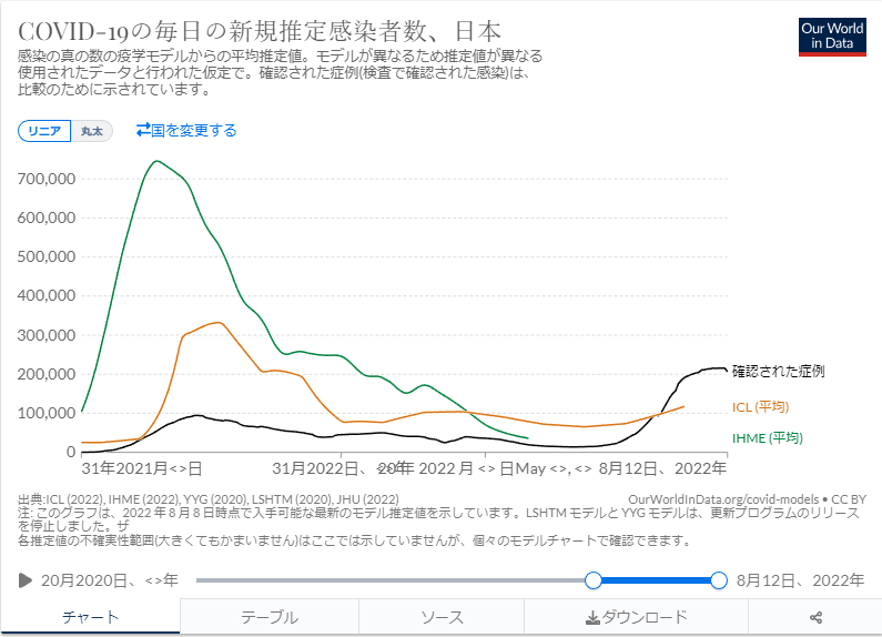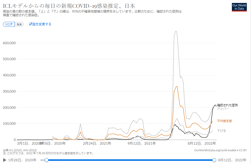 下のグラフは日本のオミクロン感染状況のICL及びHMEモデルにによる推定値と確認値の関係を示したもので、推定値に比べ感染確認者数が少ないことが分かる。BA.5変異感染と見られる推定はこの適用外と見られる。