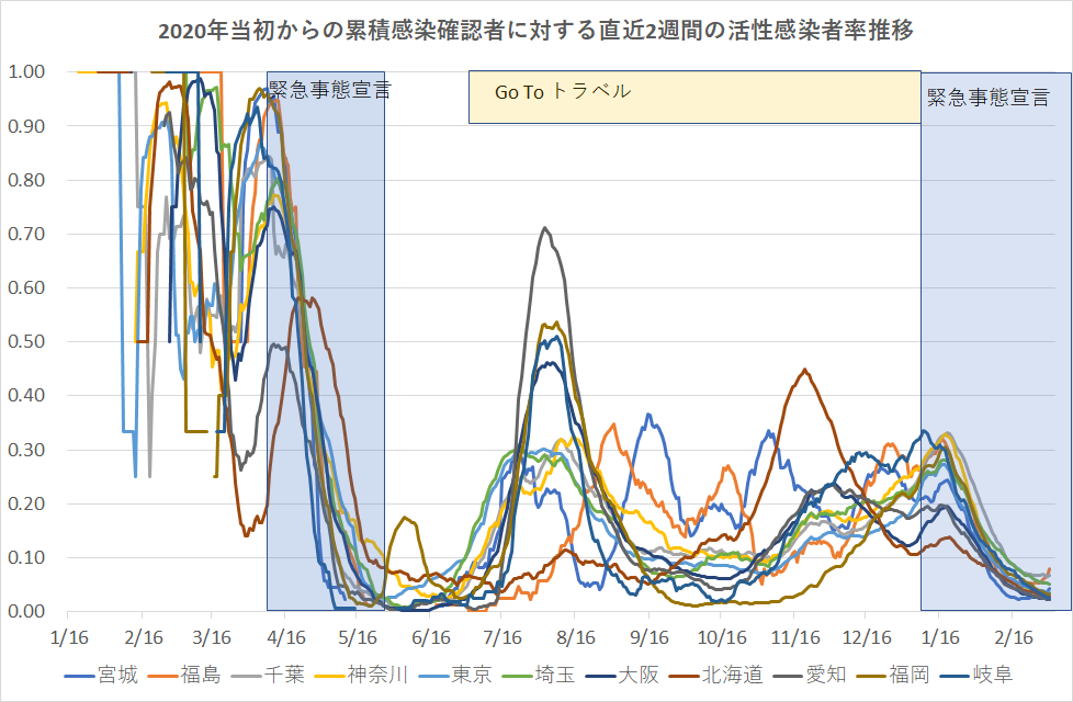 比較的人口の多い地方の行政区間における総感染確認者に対する直近2週間の活性感染者の比率を求めグラフにしたものが下図である。