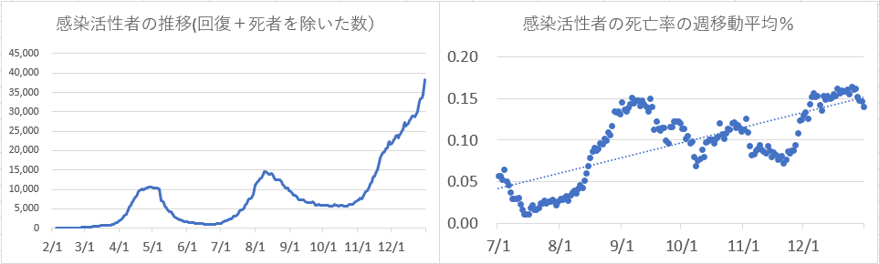 残念ながら、日本における第三波の拡大に終わりは見えないが。今のところ感染者確認数増に比べ死亡者数は比較的少ない状態で経過している。