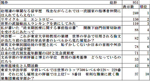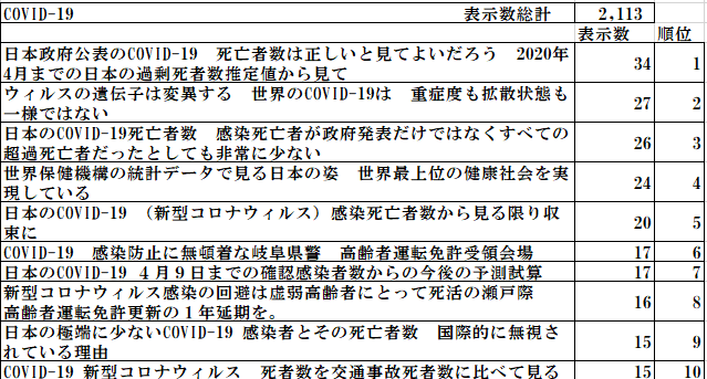 この表で問題にしたいのは、感染の始まりから直近までの感染者累積人数が情報として何の意味がるのか? 外国の主なデータベースでも記載している基本データだから当たり前と言われればそれまでだが、特にカッコ内の前日比については、集計発表値の週日依存性(日曜日が最も少ない周期性)が強く、実勢の感染増ではないことが分かっている。この表は、感染確認者の加算数であるから増加しかありえない数字にわざと+マークを付けて表示する(+144)等、情報として無意味であるばかりか、誤解を生む興味本位の記載としか言えない。