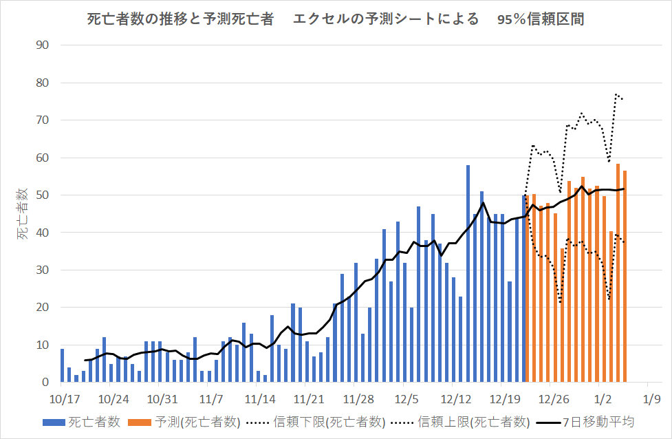 日本のCOVID-19感染死亡者数の予測 来年1月5日まで エクセルの予測シートによる