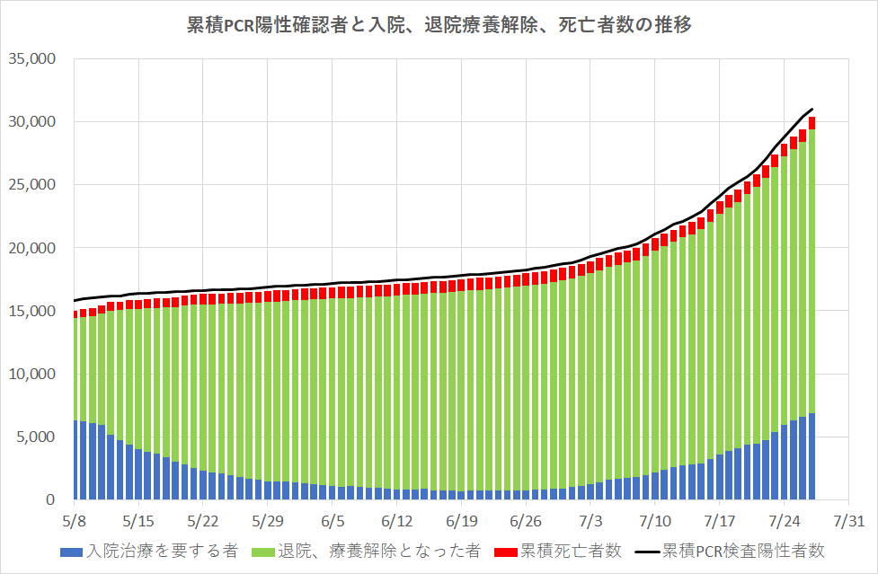 厚生労働省で集計された新型コロナウィルス感染者データベース「オープンデータ」からPCR検査陽性確認者数、入院加療・退院者数及び死亡者数についてその累計値をグラフに描いたものが下図である。5月7日と8日の不連続は収録方法の変更によるものである。ここで、「入院を要する者+退院者」とは後尾に記した集計基準の①と②の合計値である。