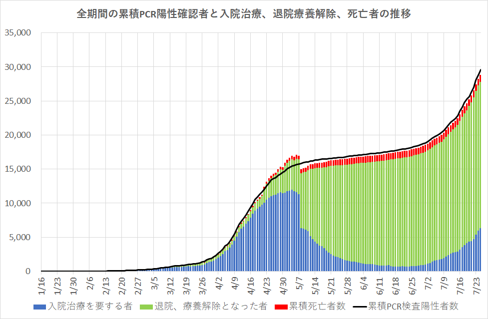 累積PCR陽性確認者数の増加とともに全期間同じ割合で入院医療治療とその結果である回復者が記録されている。残念ながら死亡者も見られるが、ほぼ同じか減少傾向であることが分かる。感染者総数と医療記録数には少し空白が見られるが、それぞれの記録には判定の困難や入院待機中・発生日との遅延等による欠落等、細部までの解明は無理のように思われる。直感的にはこのデータは非常に良い一致と見ることが出来る。